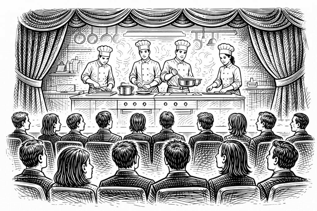 Las grandes producciones teatrales se caracterizan por ensayos exhaustivos. La aparente naturalidad en escena es resultado de repetición sistemática. En la cocina profesional, la consistencia también proviene del entrenamiento constante.